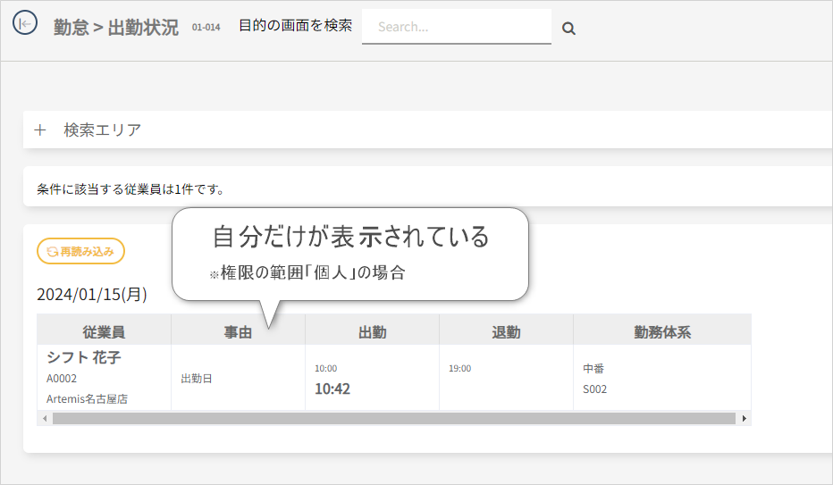 利用権限の範囲の設定で、検索結果に表示される従業員が決まっていた。