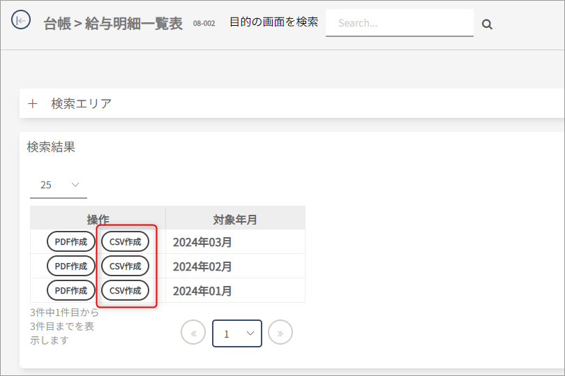 ファイルを作成したい対象月の「CSV作成」をクリックします。