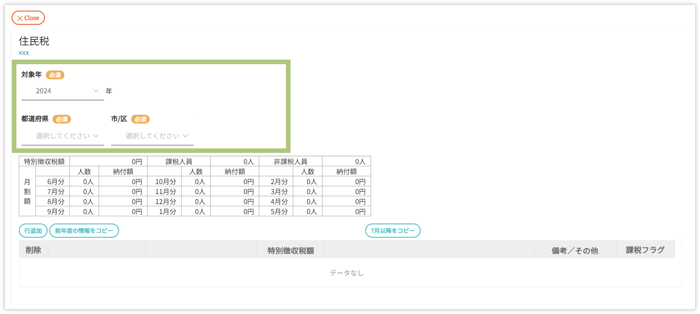 - 登録する対象の年度、納付先の市/区等の必須項目を入力してください。