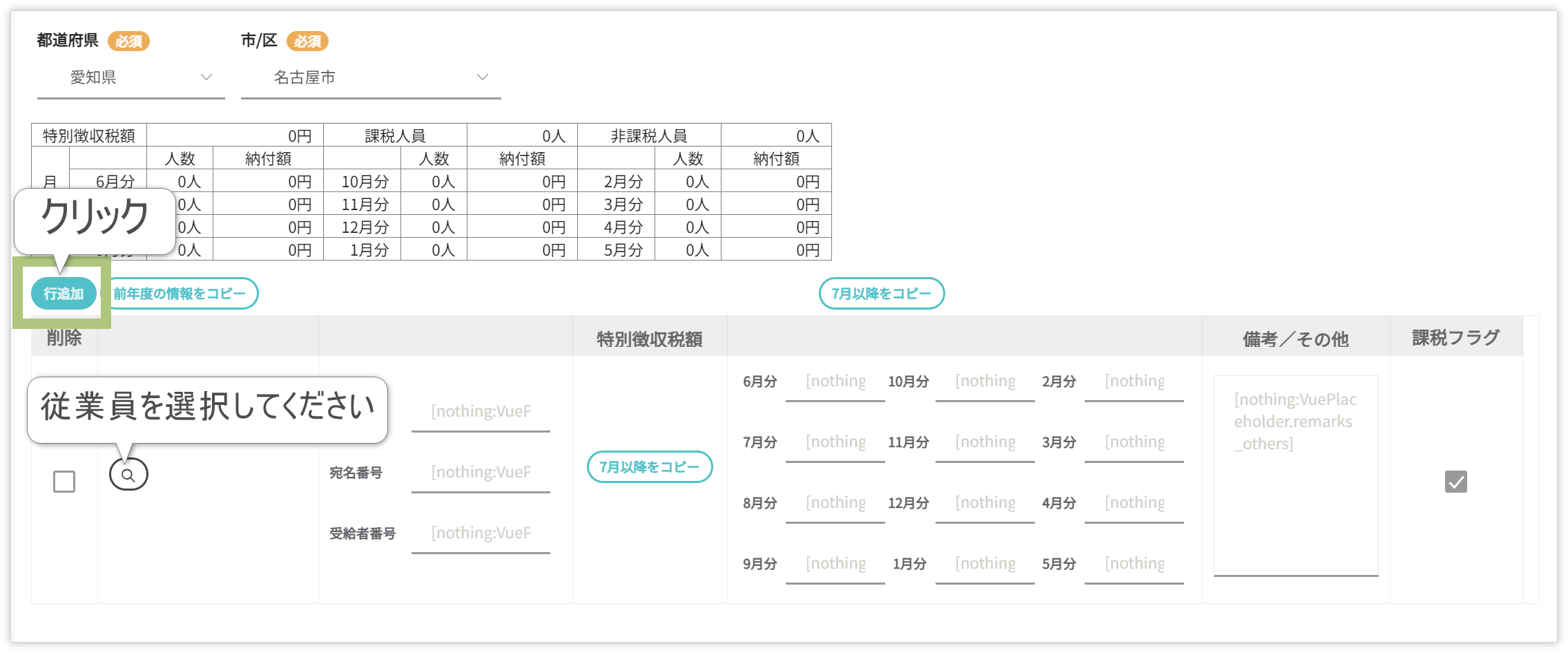 - 「行追加」をクリックすると、従業員の特別徴収税額等入力欄が表示されます。(複数人いる場合は、その人数分行追加してください)