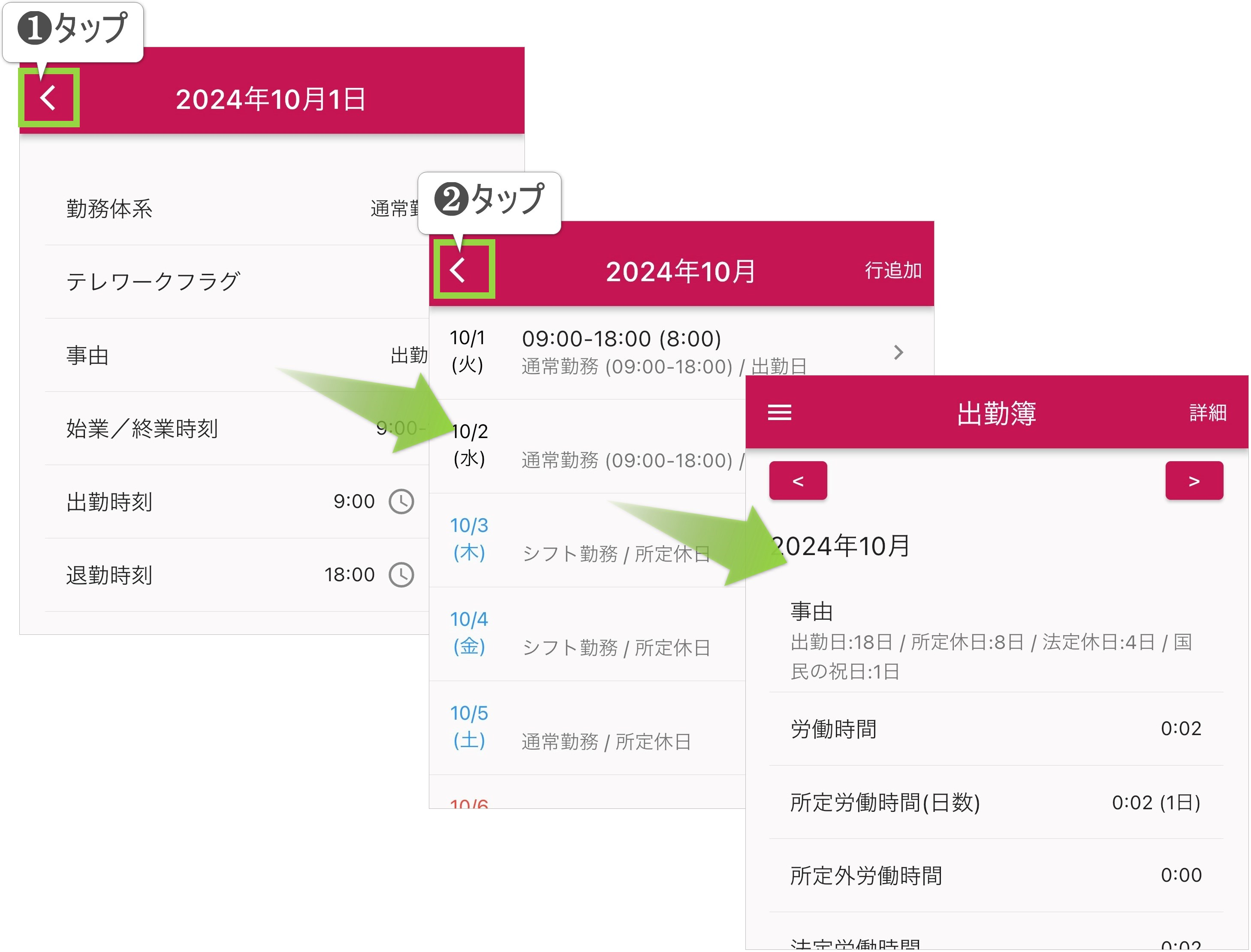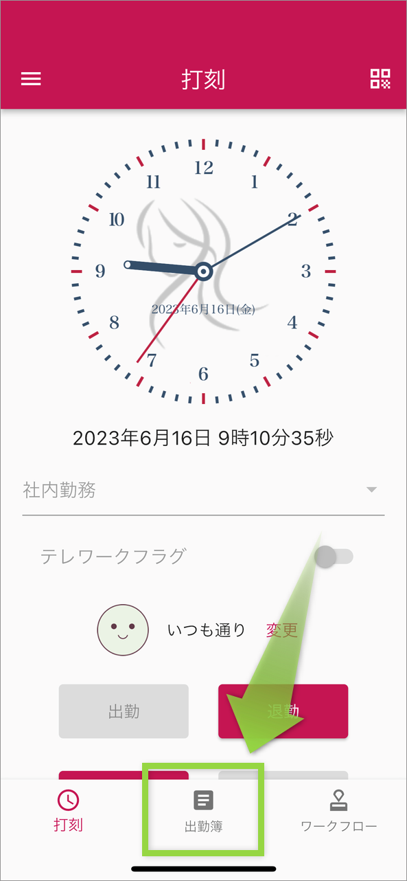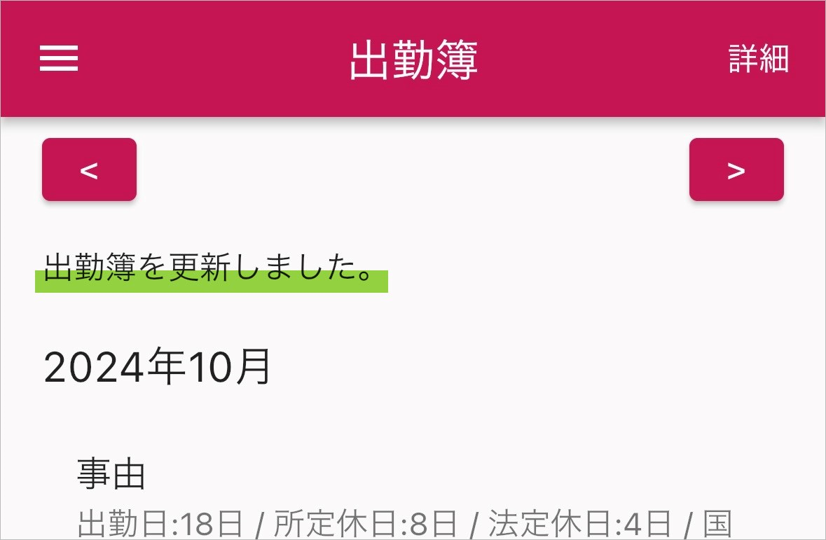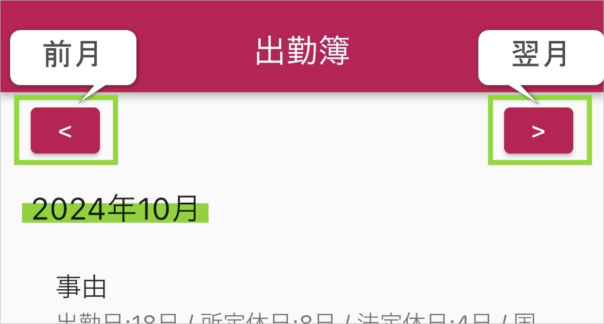 以下の画像の通り、「<」を2回タップして、出勤簿画面を開いてください。