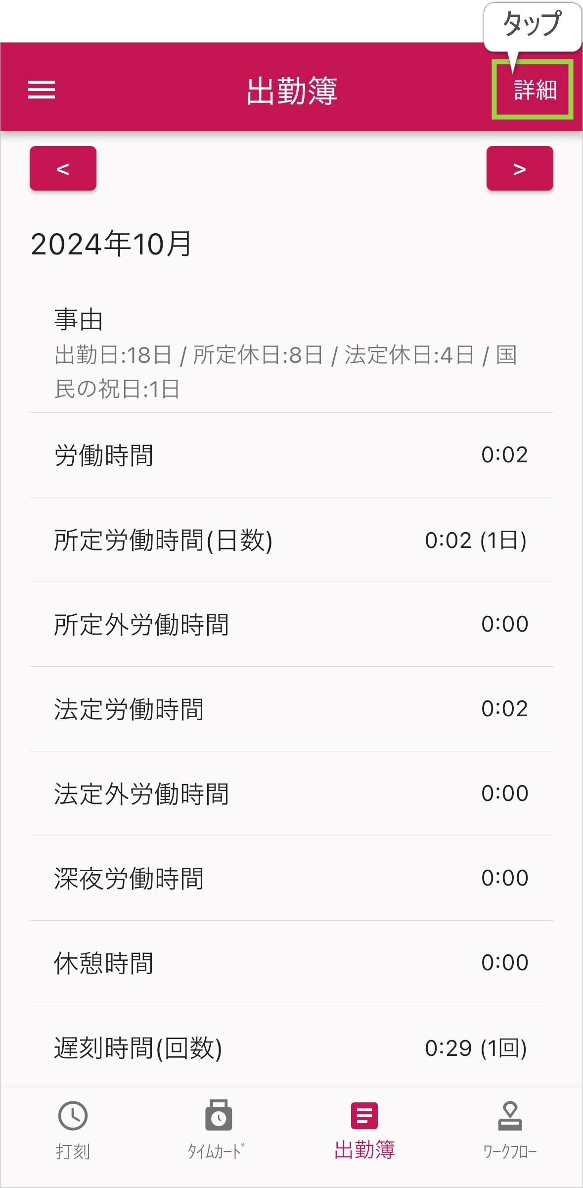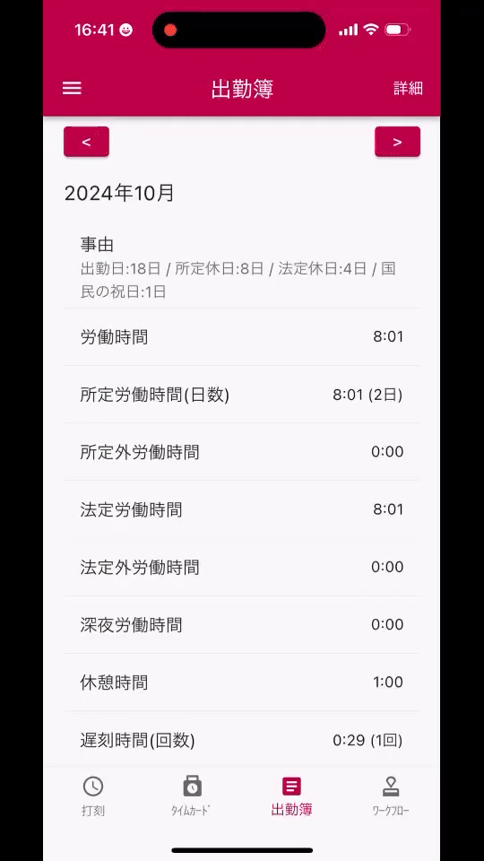 - 手順3で「詳細」をタップすると、出勤簿詳細画面が開きます。