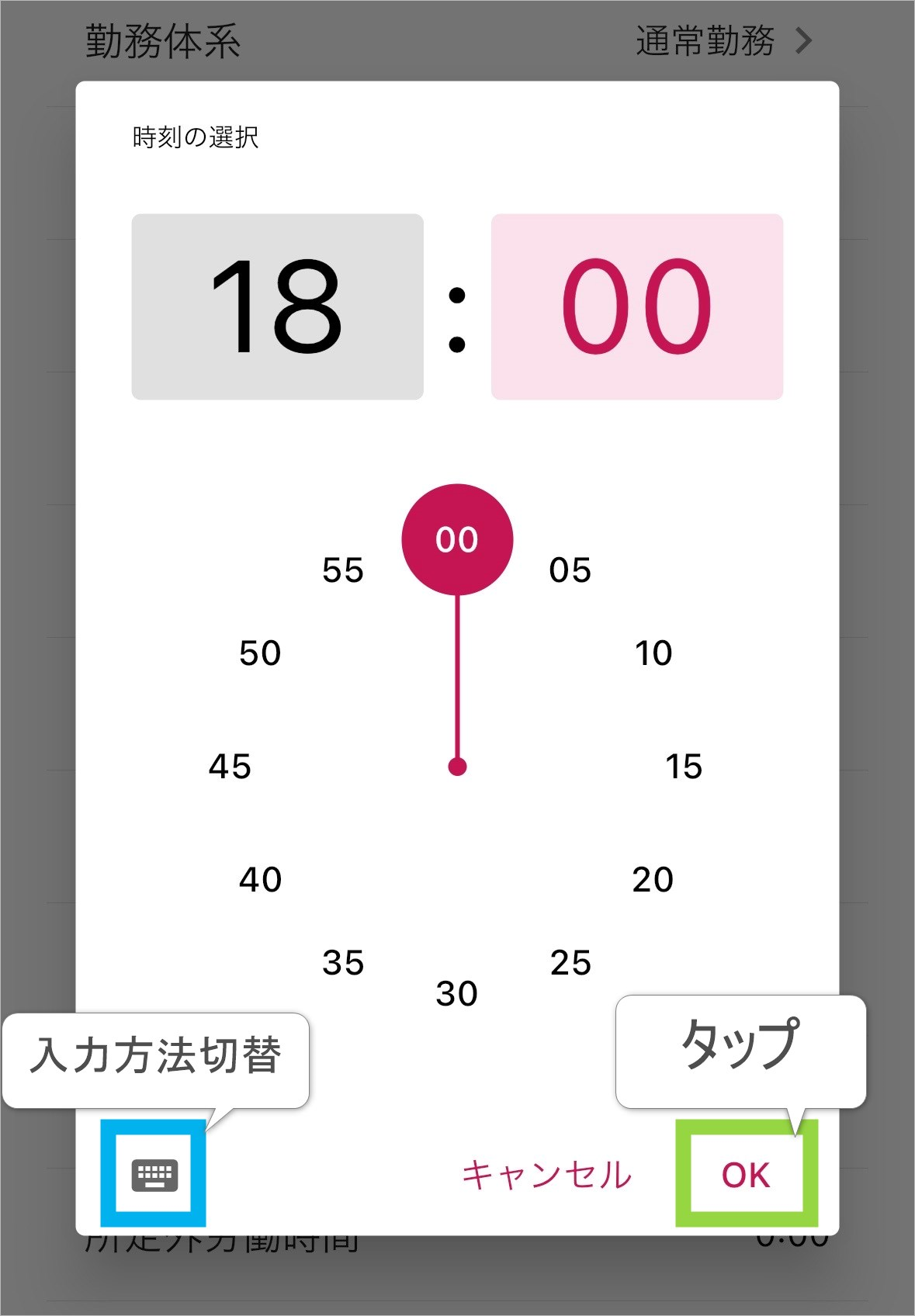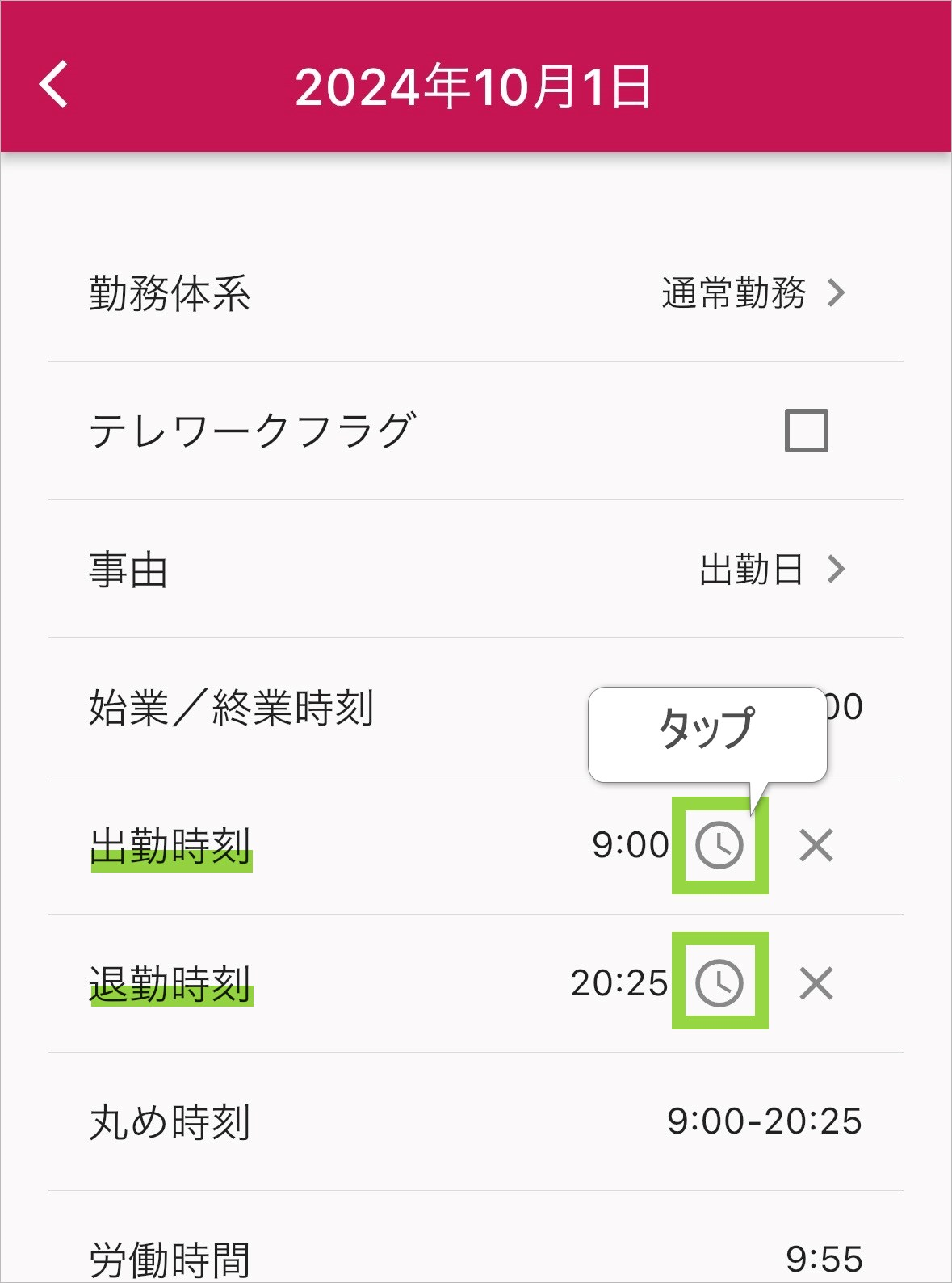出勤時刻、退勤時刻の行に表示される「時計マーク」をタップして時刻の選択画面を開きます。
