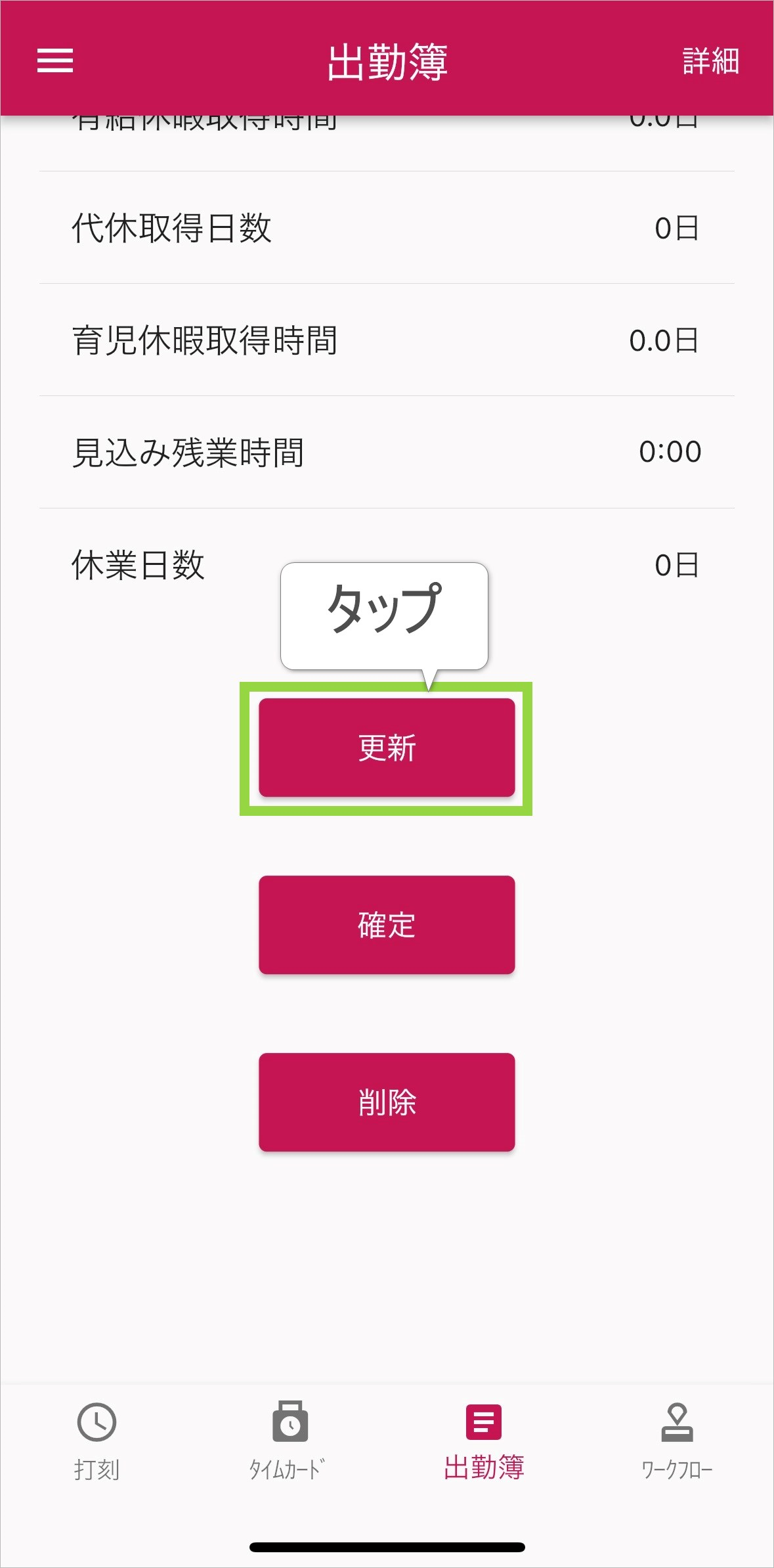 - 手順4で対象日の行をタップすると、対象日詳細画面が開きます。