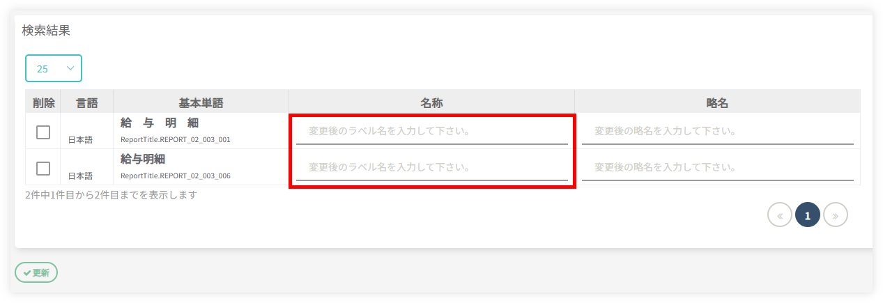 - 検索結果に表示される2件(※)にの「名称」欄に、変更後のタイトルを入力してください。