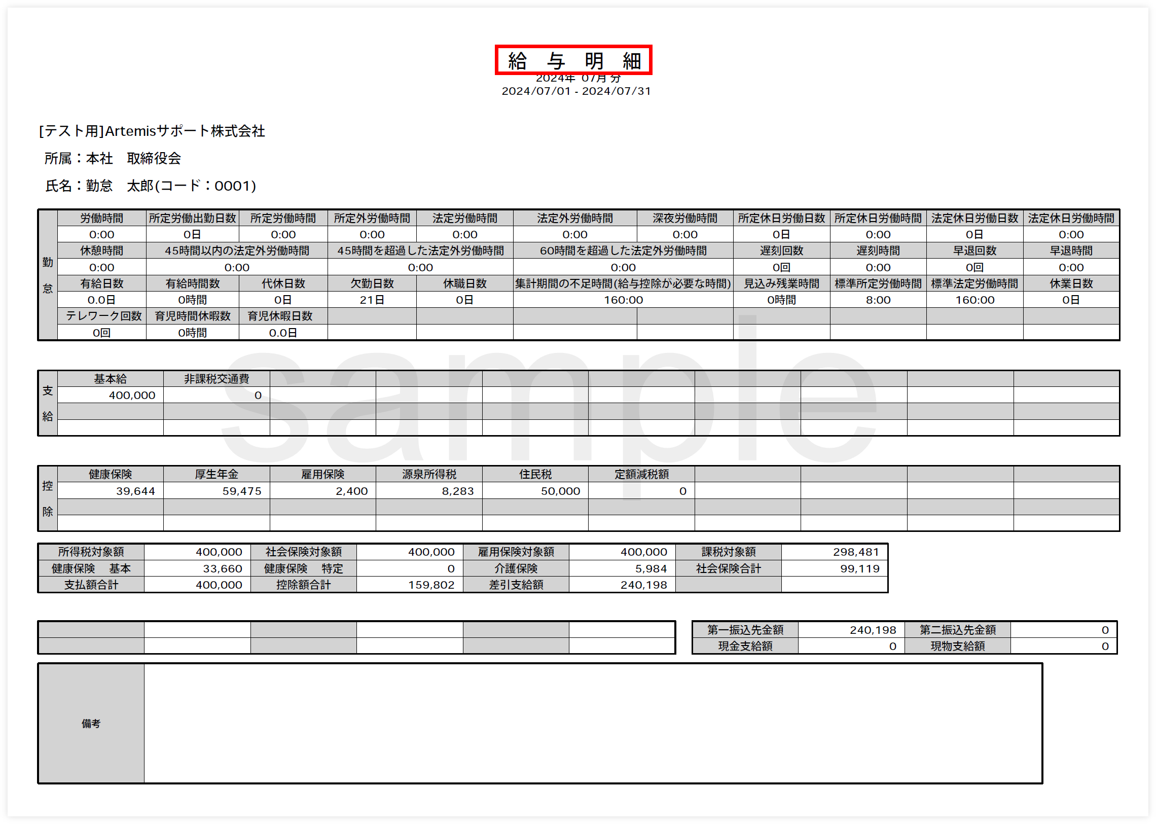 赤枠部分のタイトルが変更できます。 支給項目数21項目以上の給与明細レイアウトを設定している場合のタイトルです。 |