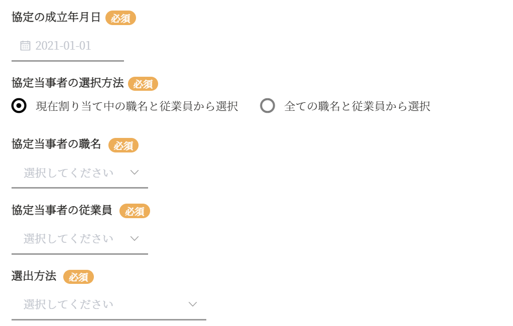 協定当事者の職名を指定してください。 ※職名は、役職画面で登録し、従業員に設定します。 |