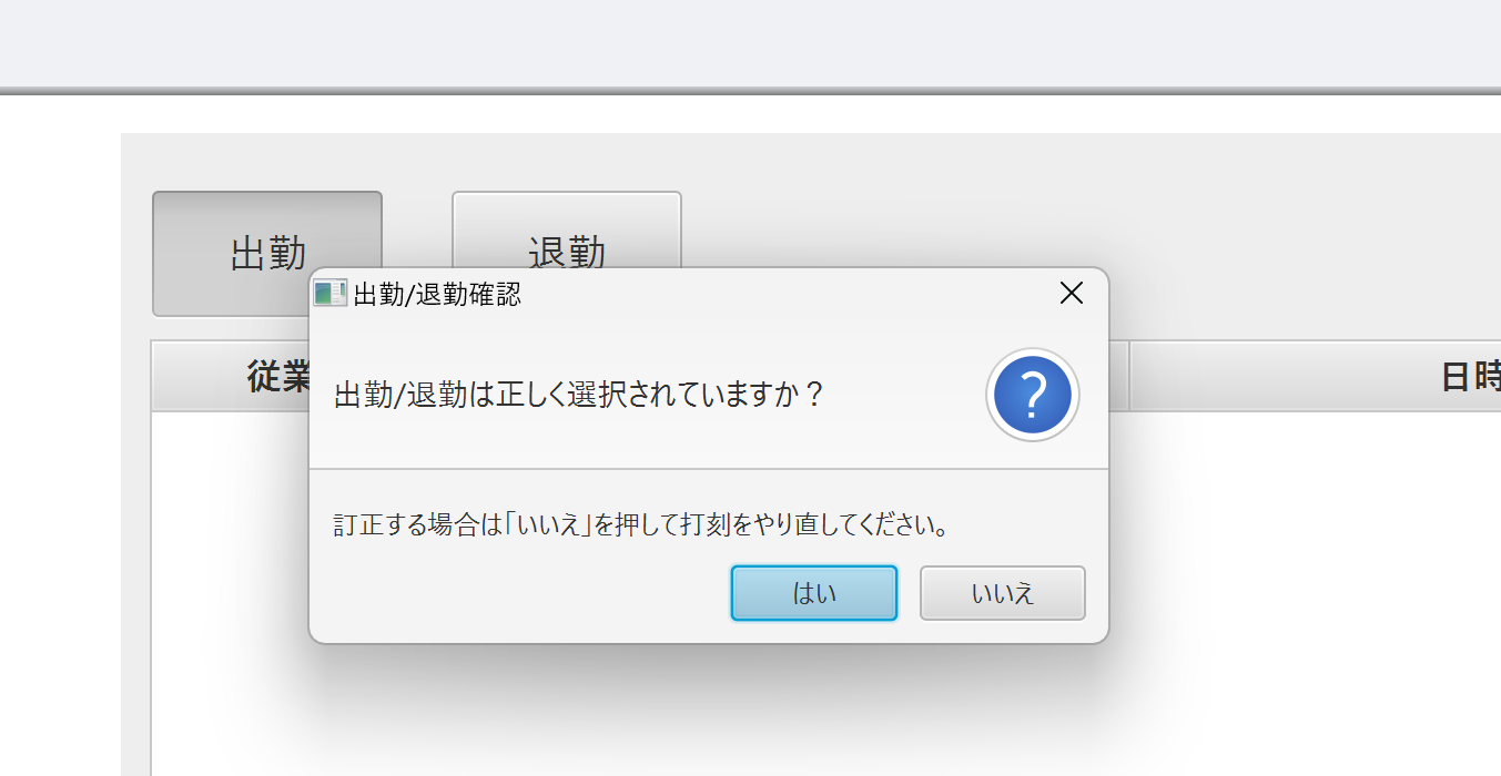 基準時刻を入力すると、打刻画面でICカードをかざした時に打刻選択が基準と合わないとメッセージが表示されます。 「12:00」のように時間を入力してください。 (例)10:00と入力してログインした場合、 11時に出勤打刻を選択してICカードをかざしとき、確認メッセージが表示されます。(この時点で打刻はされていません)