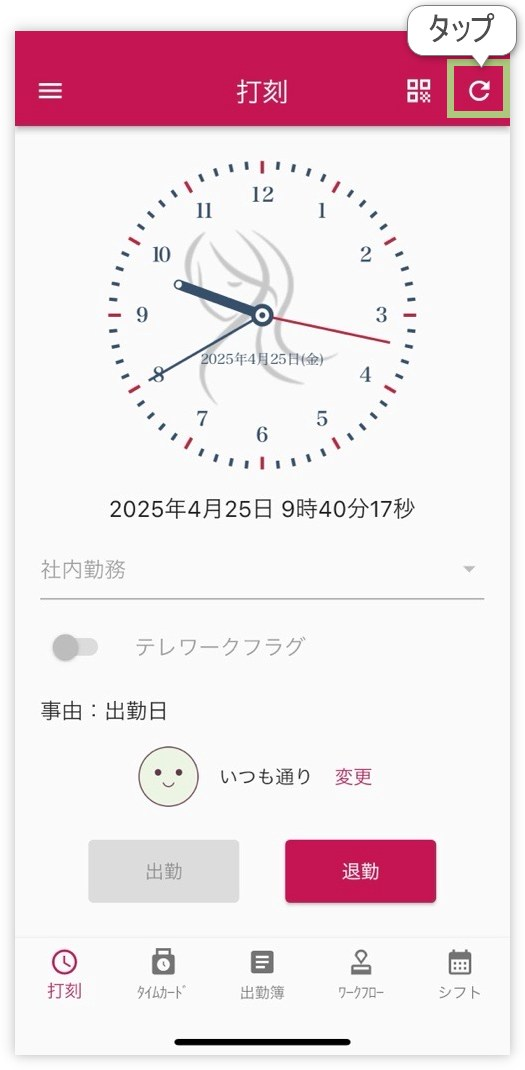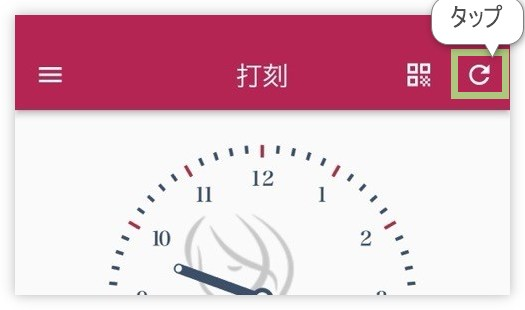 打刻前に「事由や勤務体系が変わったかもしれない」と思った場合は、 打刻画面右上の「更新アイコン(丸い矢印)」をタップして情報を再取得してください。