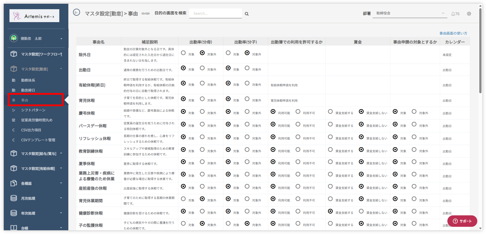 マスタ設定[勤怠]>事由 を開きます。
