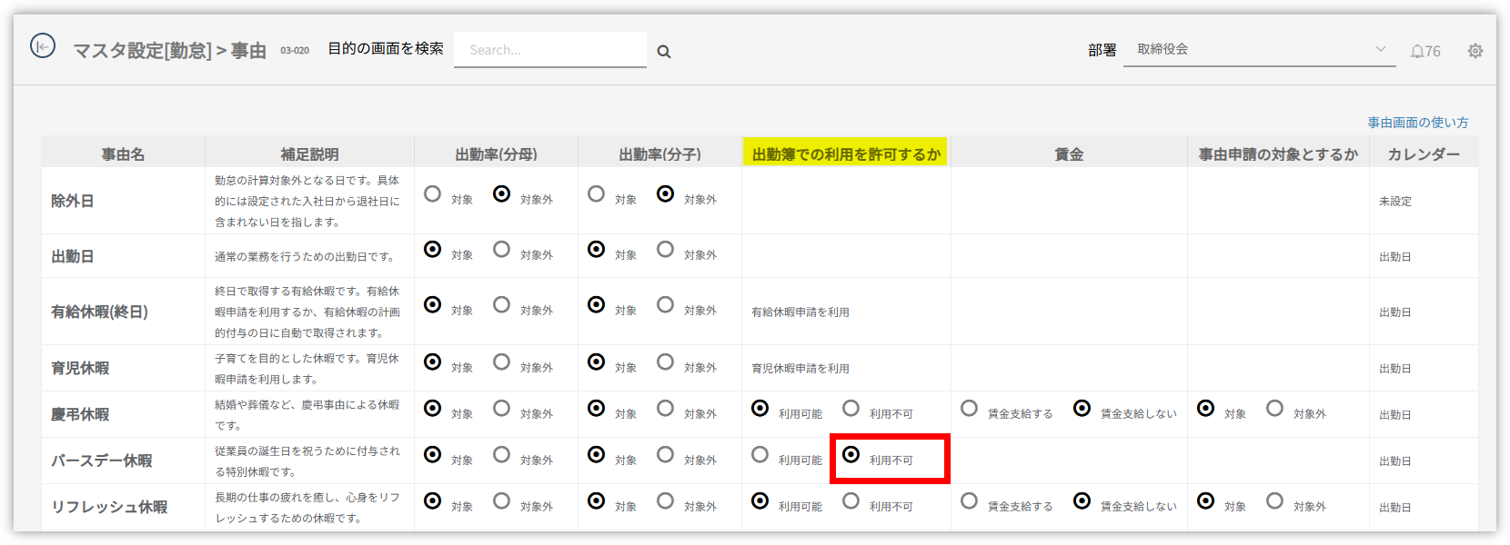 「出勤簿での利用を許可するか」欄で[利用不可] を選択します。