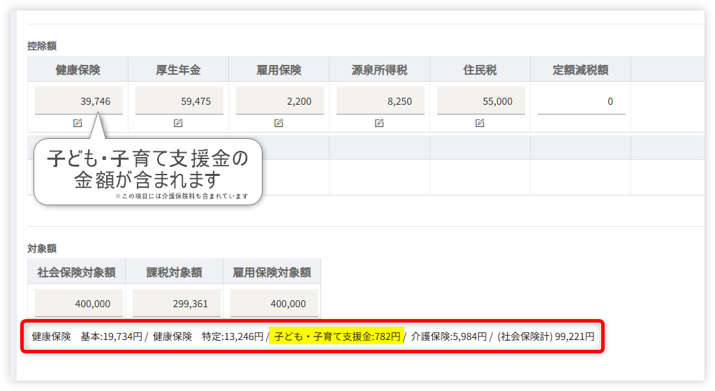 計算された子ども・子育て支援金の金額は、以下の画面に表示されます。