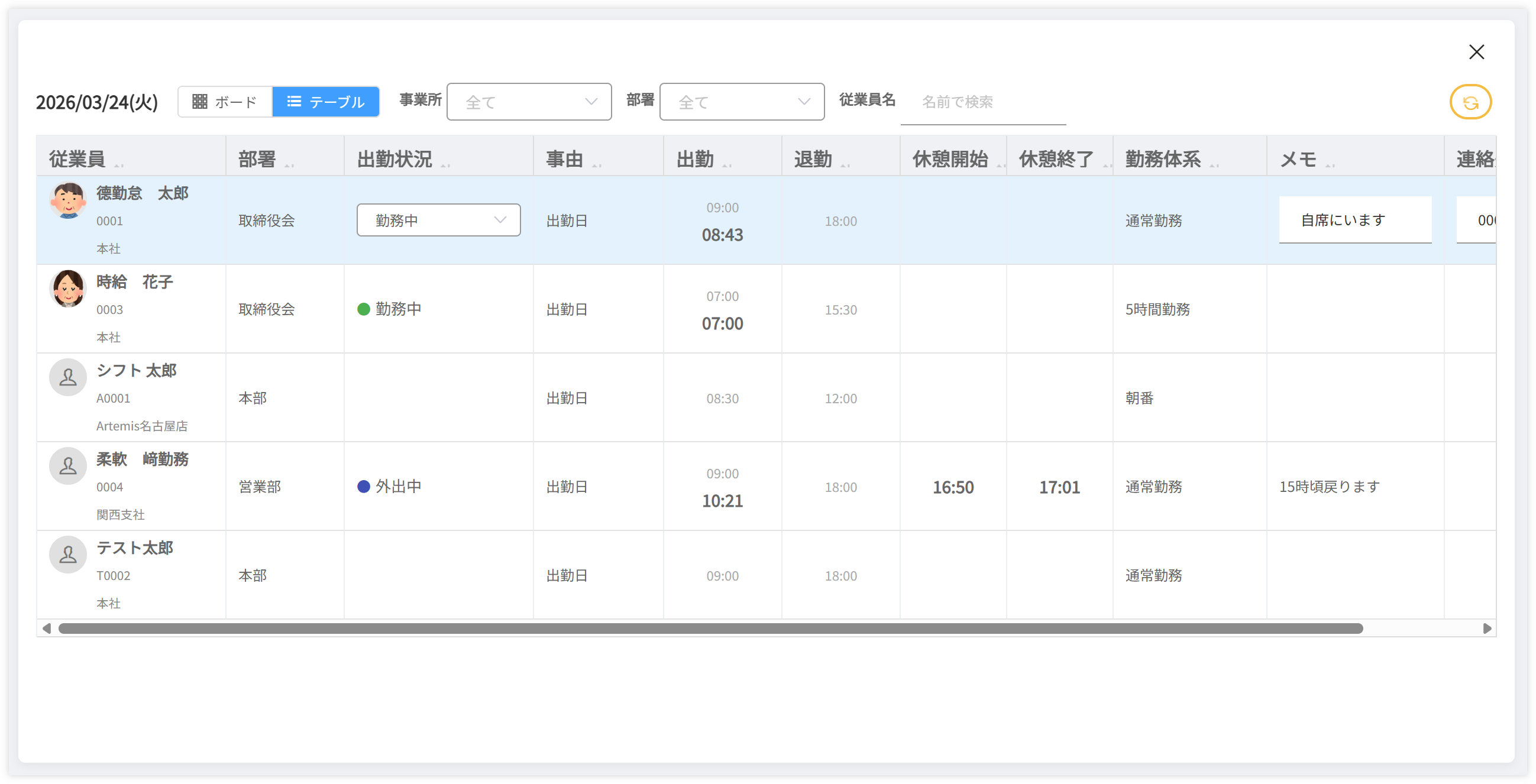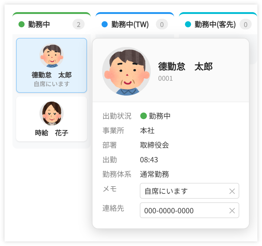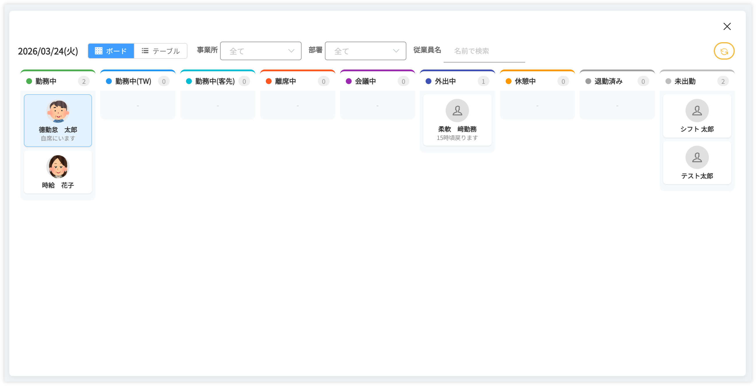 勤務中・休憩中・外出中などの状態ごとに従業員が表示されるため、社内の在席状況を一覧で把握することができます。