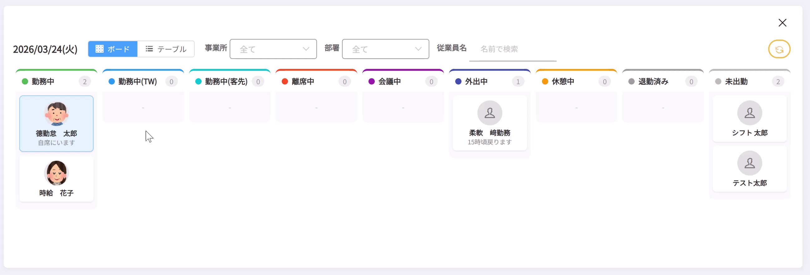 ボード表示では、従業員カードをドラッグ&ドロップすることで状態を変更できます。