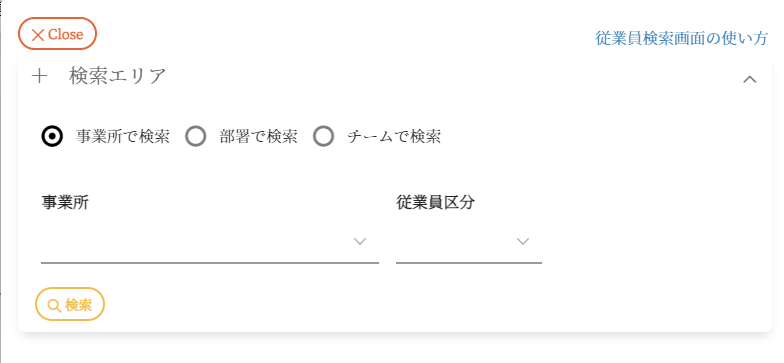 従業員検索用のサブ画面が開きます。検索したい従業員が不明な場合、「従業員検索画面の使い方」から従業員を絞り込むことができます。 |