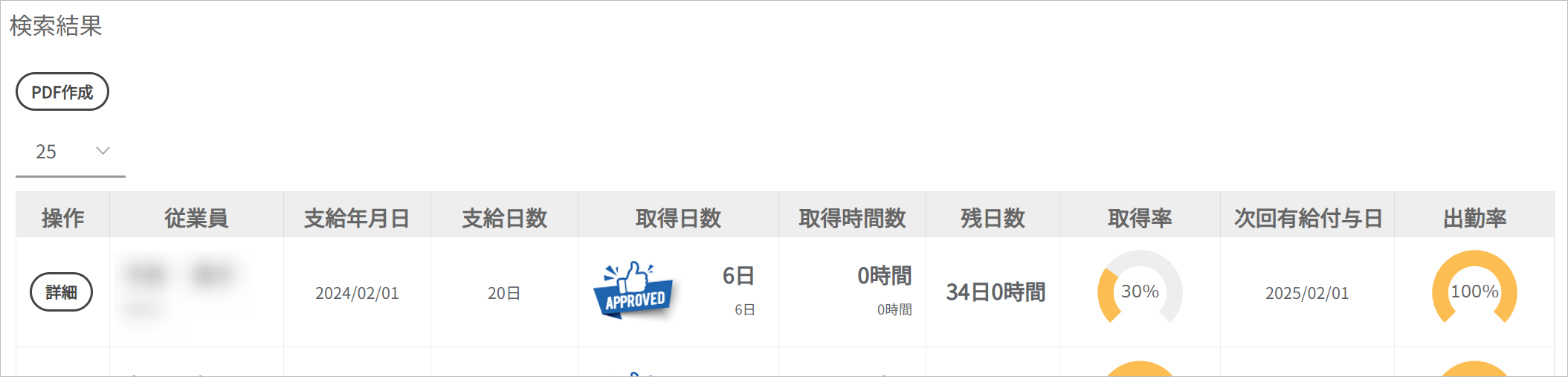 従業員ごとの出勤率 有給が支給されたことがない従業員は、最初の有給が支給されるまでの出勤率が表示されます。 |