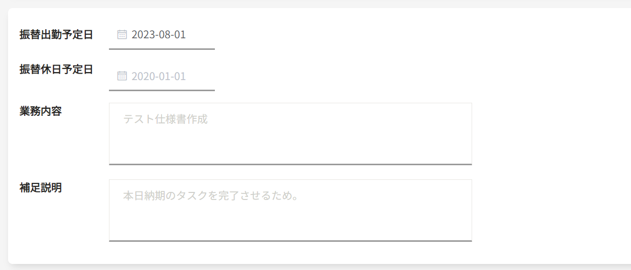 | 振替出勤予定日 | 振替出勤の予定日を入力してください。 |
