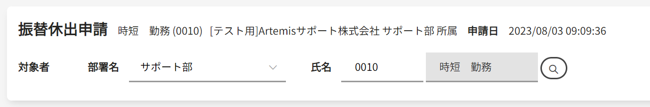 | 対象者 | 申請の対象となる従業員の部署名、従業員コード、従業員名です。 |