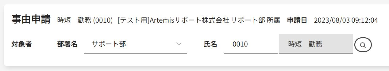申請をする従業員情報です。 左から、従業員名、従業員コード、会社名、部署名です。 |