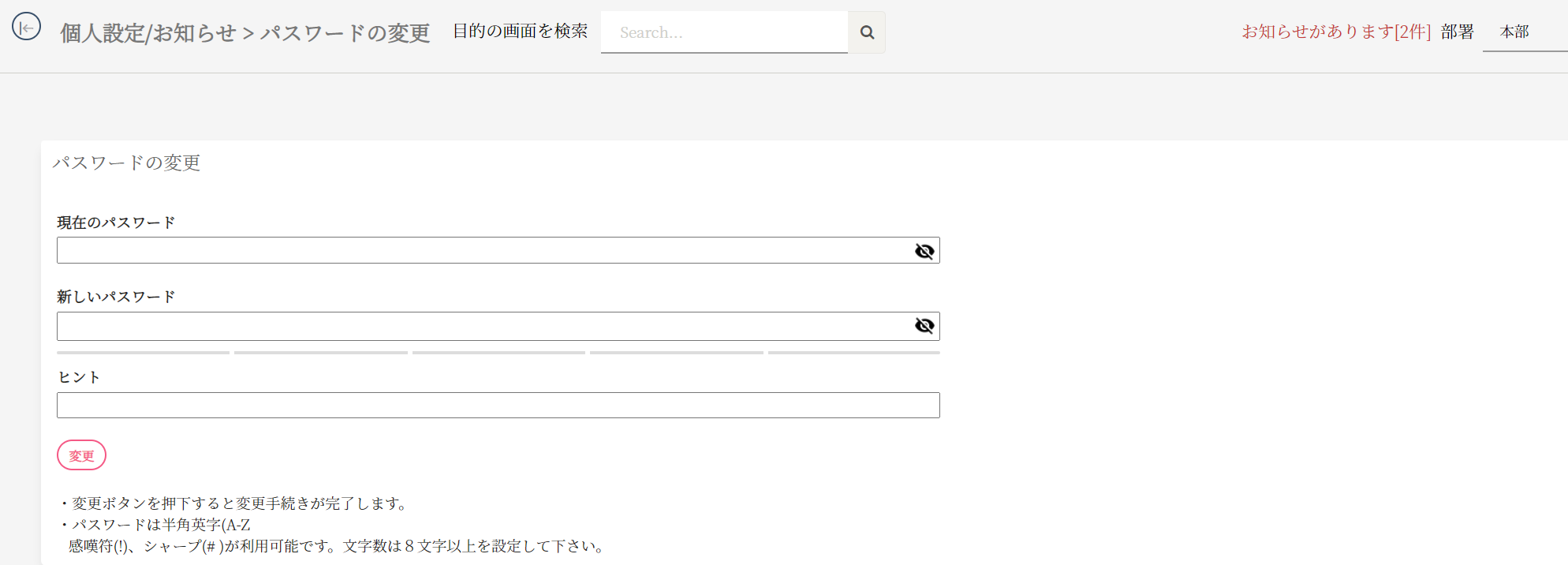 パスワードの変更画面は、現在のパスワードから新しいパスワードへ変更する画面です。